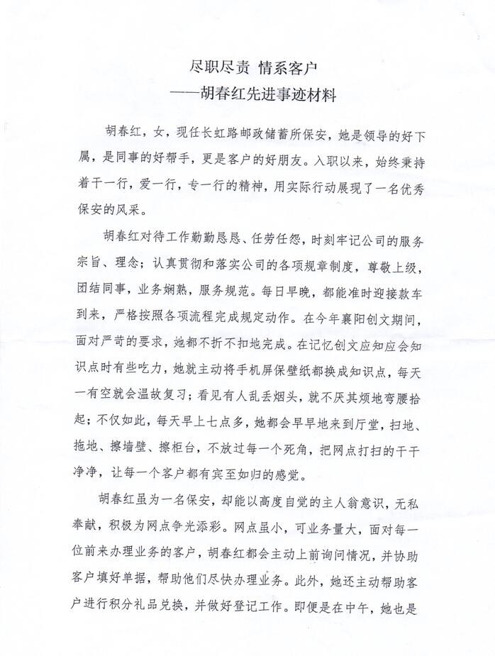 胡春紅,女,現(xiàn)任長虹路郵政儲蓄所保安,她是領(lǐng)導(dǎo)的好下屬,是同事的好幫手,更是客戶的好朋友。入職以來,始終秉持著干一行,愛一行,專一行的精神,用實際行動展現(xiàn)了一名優(yōu)秀保安的風(fēng)采。胡春紅對待工作勤勤懇懇、任勞任怨,時刻牢記公司的服務(wù)宗旨、理念;認(rèn)真貫徹和落實公司的各項規(guī)章制度,尊敬上級,團(tuán)結(jié)同事,業(yè)務(wù)嫻熟,服務(wù)規(guī)范。每日早晚,都能準(zhǔn)時迎接款車到來,嚴(yán)格按照各項流程完成規(guī)定動作。在今年襄陽創(chuàng)文期間,面對嚴(yán)苛的要求,地都不折不扣地完成。在記憶創(chuàng)文應(yīng)知應(yīng)會知識點時有些吃力,她就主動將手機(jī)屏保壁紙都換成知識點,每天有空就會溫故復(fù)習(xí):看見有人亂丟煙頭,就不厭其煩地彎腰拾起;不僅如此,每天早上七點多,她都會早早地來到廳堂,掃地拖地、擦墻壁、擦柜臺,不放過每一個死角,把網(wǎng)點打掃的干干凈凈,讓每一個客戶都有賓至如歸的感覺。胡春紅雖為一名保安,卻能以高度自覺的主人翁意識,無私幸獻(xiàn),積極為網(wǎng)點爭光添彩。網(wǎng)點雖小,可業(yè)務(wù)量大,面對每位前來辦理業(yè)務(wù)的客戶,胡春紅都會主動上前詢問情況,并協(xié)助客戶填好單據(jù),幫助他們盡快辦理業(yè)務(wù)。此外,她還主動幫助客戶進(jìn)行積分禮品兌換,并做好登記工作。即便是在中午,她也是匆忙吃過飯后,主動放棄午休,繼續(xù)投入到工作中。由于網(wǎng)點只能辦理金融業(yè)務(wù),有些客戶不知情,進(jìn)店詢問郵務(wù)類業(yè)務(wù),甚至只是嚼水、問路,胡春紅都會熱情迎客,耐心解答,做到知無不言,言無不盡視客戶如親人,這是胡春紅一直堅持的信念,對待每位客戶胡春紅都做到了來有迎聲,走有送聲,不僅如此,她還想客戶之所想,急客戶之所急她所在的網(wǎng)點有兩位特殊的客戶,由于偏癱,每月都必須由年邁的母親騎著三輪車帶女幾來領(lǐng)低保,母親沒有什么文化,也不會寫字,每次母女兩剛到門口,胡春紅都會馬上迎出門去,攙扶客戶進(jìn)店,幫助客戶填單,同時還會噓寒問暖,問問母女兩有沒有什么困難需要幫助??蛻羰指屑?多次提出送點禮物給胡春紅,也都被她一一謝絕了。