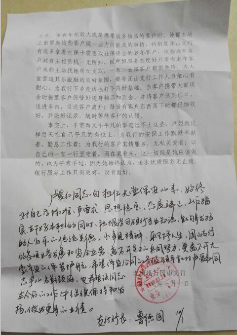 在客流量較多時(shí)地能主動(dòng)鋪助大堂經(jīng)理完成客戶的分流和引導(dǎo)工作,當(dāng)有年紀(jì)較大或是攜帶較多物品的客戶時(shí),她都主動(dòng)上前幫助這些客戶做一些力所能及的事情,特別是團(tuán)山有很多拿著社??ㄐ枰∩绫YY金的老年客戶,這些老年客戶對(duì)自主柜員機(jī)一無(wú)所知,因盧姐服務(wù)態(tài)度好只要有老年客戶來(lái)都主動(dòng)找她幫忙支取,一米二去跟吝戶都很熟絡(luò),為大堂營(yíng)造其樂(lè)融融的良好氛圍,都夸團(tuán)山支行工作人員細(xì)心有耐心,為我行下鄉(xiāng)走訪也打下良好基礎(chǔ)。當(dāng)客戶攜帶大額現(xiàn)金時(shí)提醒客戶保管好隨身物品和現(xiàn)金、并將客戶送到門口送進(jìn)車內(nèi),日送客戶離開;每當(dāng)有客戶東西落下時(shí)都仔細(xì)收好,并做好記錄,隨時(shí)等待客戶的認(rèn)領(lǐng)